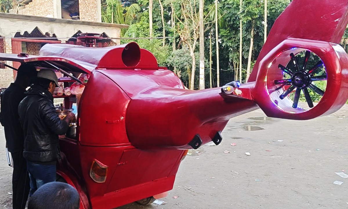 হেলিকপ্টারের মতো আকাশে ওড়ার কথা থাকলেও বাগেরহাটের ফকিরহাট উপজেলার দক্ষিণ খানপুর গ্রামের সোহেল শেখের তৈরি হেলিকপ্টারটি চলছে গ্রামের মাটির রাস্তায়। আকৃতিতে এটি পুরোপুরি হেলিকপ্টারের মতো— উপরে ব্লেড, পেছনে লেজ, ভেতরে চালকের আসন সবই রয়েছে। তবে এটি কোনো আকাশযান নয়; মোটরচালিত তিন চাকার একটি যান যা সড়কে চলার উপযোগী।