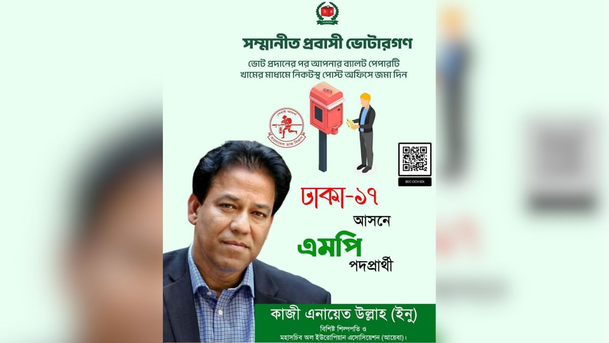 প্রবাসী ভোটারদের ব্যালট পেপার সঠিকভাবে জমা দেওয়ার আহ্বান জানিয়েছেন ঢাকা-১৭ আসনে সংসদ সদস্য পদপ্রার্থী কাজী এনায়েত উল্লাহ।