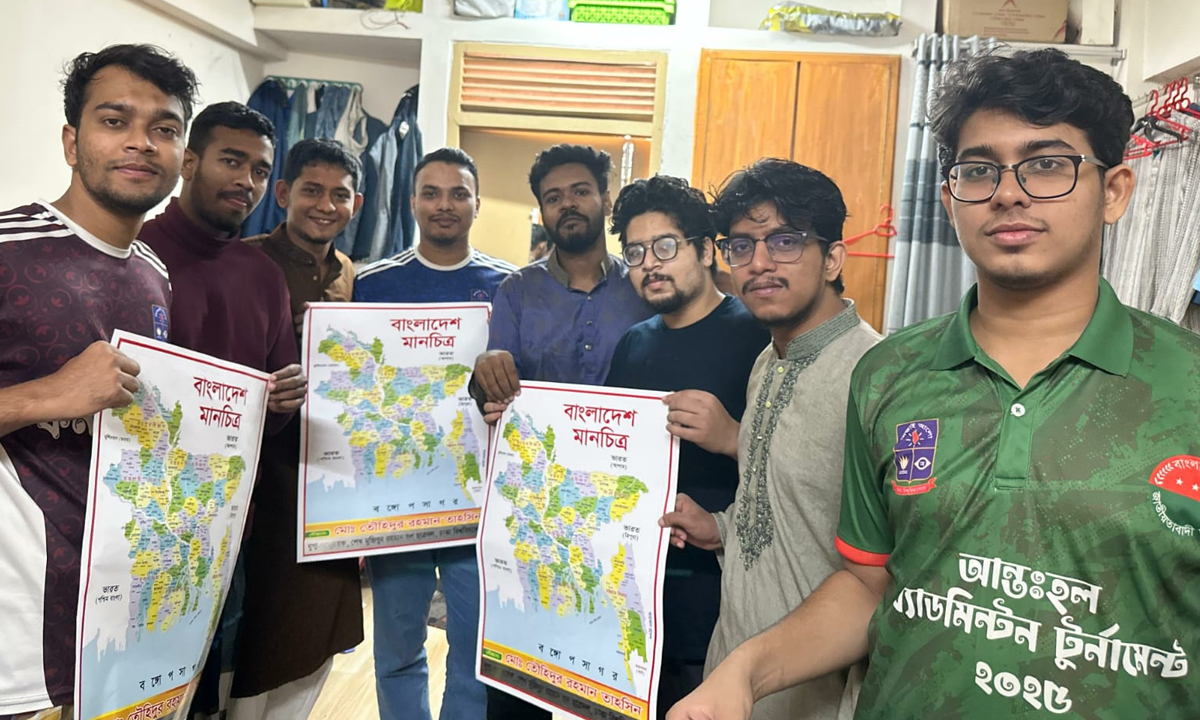 ঢাকা বিশ্ববিদ্যালয়ের শেখ মুজিবুর রহমান হলের প্রতিটি কক্ষে শিক্ষার্থীদের মধ্যে ‘বাংলাদেশের মানচিত্র’ বিতরণ করেছেন হল ছাত্রদলের যুগ্ম আহবায়ক মো. তৌহিদুর রহমান তাহসিন।