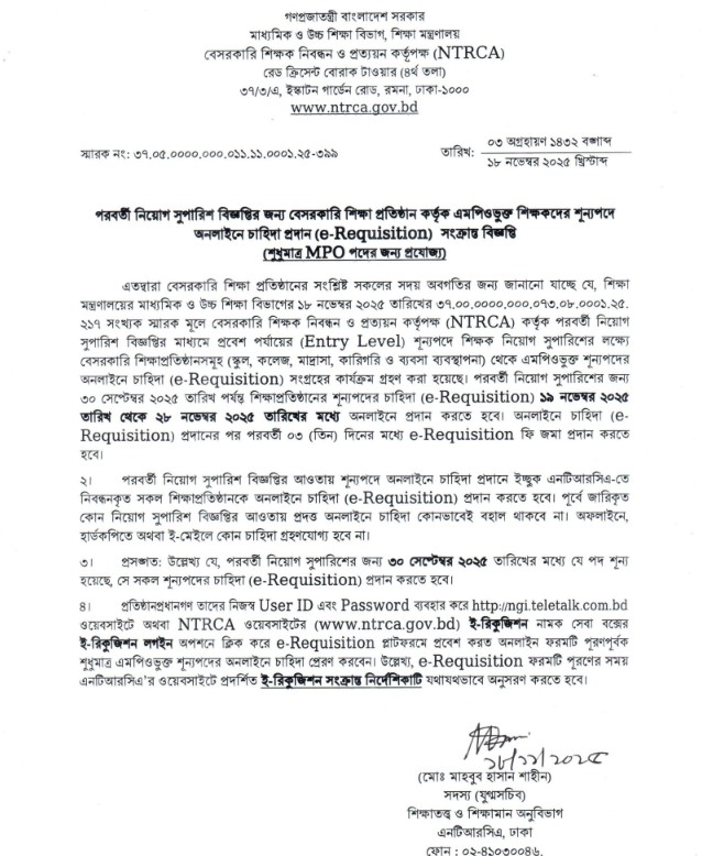 বিজ্ঞপ্তিতে বলা হয়, বেসরকারি শিক্ষক নিবন্ধন ও প্রত্যয়ন কর্তৃপক্ষ কর্তৃক পরবর্তী নিয়োগ সুপারিশ বিজ্ঞপ্তির মাধ্যমে প্রবেশ পর্যায়ের শূন্যপদে শিক্ষক নিয়োগ সুপারিশের লক্ষ্যে বেসরকারি শিক্ষাপ্রতিষ্ঠানসমূহ (স্কুল, কলেজ, মাদরাসা, কারিগরি ও ব্যবসায় ব্যবস্থাপনা) থেকে এমপিওভুক্ত শূন্যপদের অনলাইনে চাহিদা সংগ্রহের কার্যক্রম গ্রহণ করা হয়েছে।