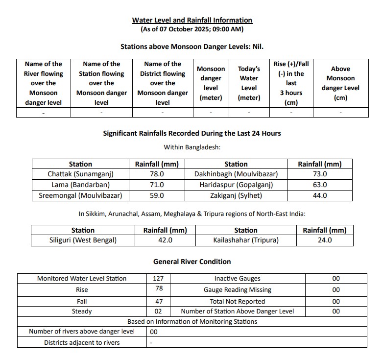 মঙ্গলবার (৭ অক্টোবর) দুপুরে বন্যা পূর্বাভাস ও সতর্কীকরণ কেন্দ্র জানায়, গত ২৪ ঘণ্টায় দেশের অভ্যন্তরে সিলেট বিভাগে ও চট্টগ্রাম বিভাগের কিছু স্থানে ভারি বৃষ্টিপাত পরিলক্ষিত হয়েছে। এর মধ্যে ছাতক (সুনামগঞ্জ) ৭৮.০ মি.মি., দক্ষিণবাগ (মৌলভীবাজার) ৭৩.০ মি.মি. ও লামা (বান্দরবন) ৭১.০ মি.মি. বৃষ্টিপাত হয়েছে। তবে উজানে ভারতে উল্লেখযোগ্য ভারি বৃষ্টিপাত পরিলক্ষিত হয়নি।