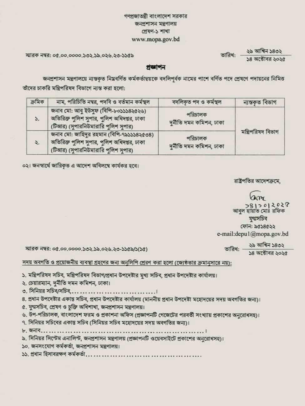 মঙ্গলবার (১৪ অক্টোবর) জনপ্রশাসন মন্ত্রণালয়ের প্রেষণ-১ শাখা থেকে এ বিষয়ে প্রজ্ঞাপন জারি করা হয়েছে। প্রজ্ঞাপনে স্বাক্ষর করেছেন মন্ত্রণালয়ের যুগ্ম সচিব আবুল হায়াত মো. রফিক।