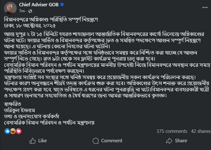 বিজ্ঞপ্তিতে বলা হয়েছে, শনিবার দুপুর ২টা ১৫মিনিটে বিমানবন্দরের কার্গো ভিলেজে অগ্নিকাণ্ডের ঘটনা ঘটে। ফায়ার সার্ভিস ও বিমানবন্দর কর্তৃপক্ষের দ্রুত ও সমন্বিত পদক্ষেপে আগুন সম্পূর্ণ নিয়ন্ত্রণে আনা হয়েছে। এ ঘটনায় কেউ প্রাণ হারায়নি বলেও নিশ্চিত করেছে মন্ত্রণালয়।