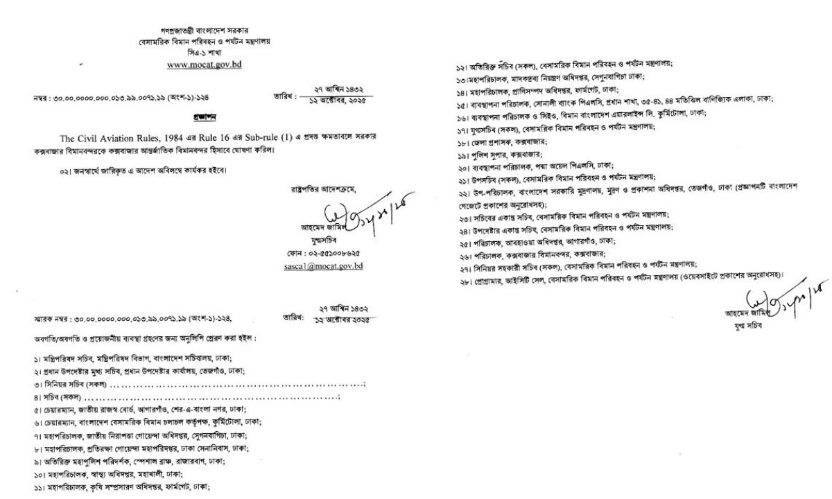 রোববার (১২ অক্টোবর) বেসামরিক বিমান পরিবহন ও পর্যটন মন্ত্রণালয় এর সিএ-১ শাখা থেকে এ সংক্রান্ত একটি প্রজ্ঞাপন জারি করা হয়েছে।