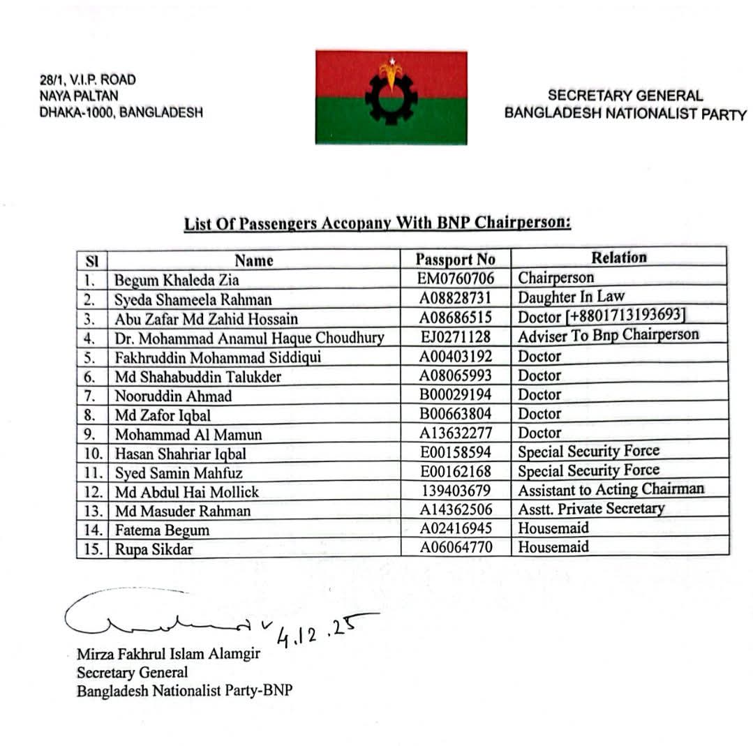 বিএনপি মহাসচিব মির্জা ফখরুল ইসলাম আলমগীর স্বাক্ষরিত এক বিবৃতিতে জানানো হয়েছে, সফরকালে বেগম খালেদা জিয়ার সঙ্গে থাকবেন প্রয়াত আরাফাত রহমান কোকোর স্ত্রী সৈয়দা শামিলা রহমান, দীর্ঘদিনের গৃহকর্মী ফাতেমা বেগম ও রুপা সিকদার।