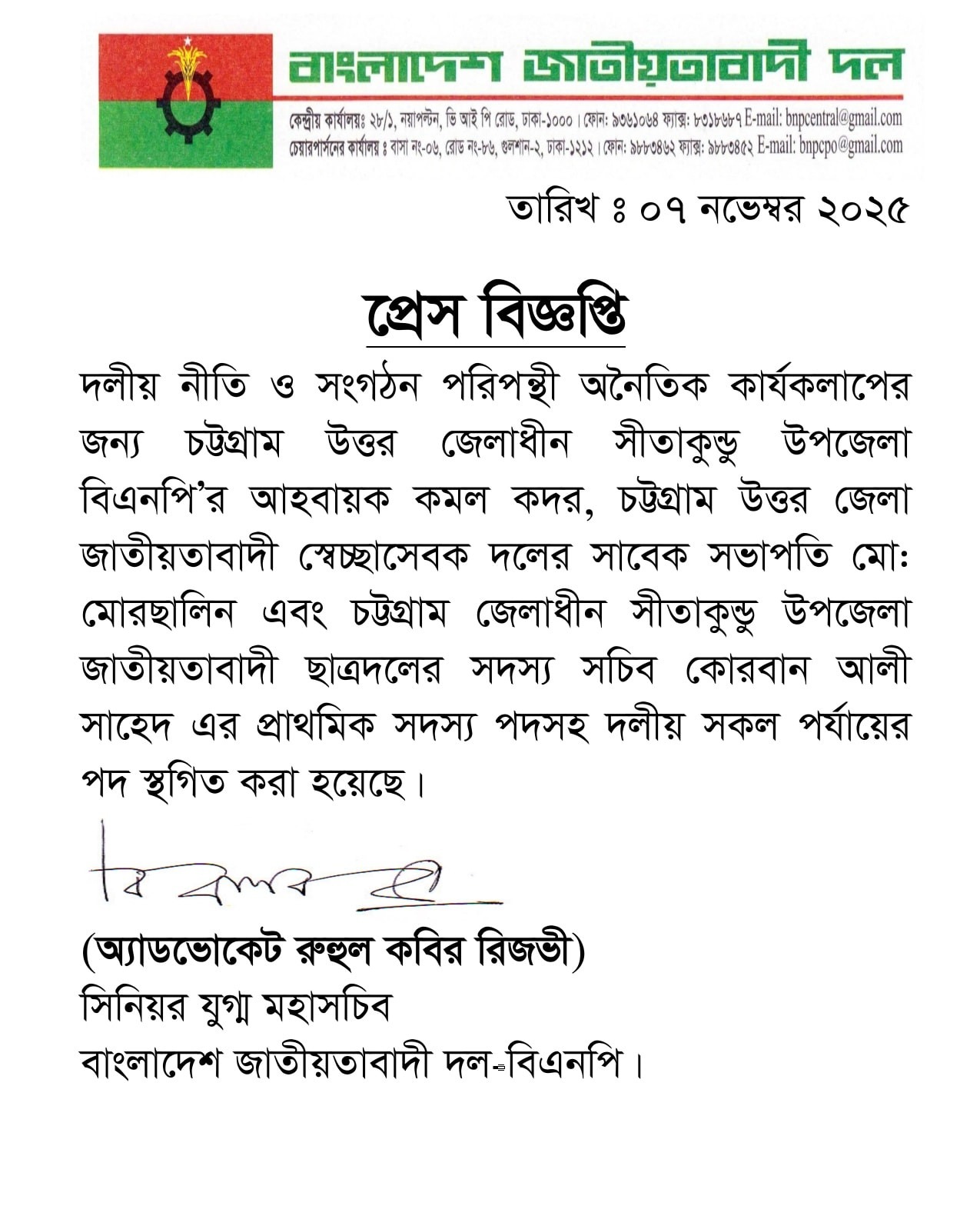 বিজ্ঞপ্তিতে বলা হয়েছে, দলীয় নীতি ও সংগঠন পরিপন্থি অনৈতিক কার্যকলাপের জন্য চট্টগ্রাম উত্তর জেলাধীন সীতাকুণ্ড উপজেলা বিএনপির আহ্বায়ক কমল কদর, চট্টগ্রাম উত্তর জেলা জাতীয়তাবাদী স্বেচ্ছাসেবক দলের সাবেক সভাপতি মো. মোরছালিন এবং চট্টগ্রাম জেলাধীন সীতাকুণ্ড উপজেলা জাতীয়তাবাদী ছাত্রদলের সদস্য সচিব কোরবান আলী সাহেদের প্রাথমিক সদস্য পদসহ দলীয় সব পর্যায়ের পদ স্থগিত করা হয়েছে।