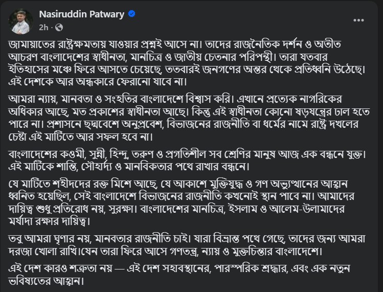 তিনি লেখেন, ‘তবু আমরা ঘৃণার নয়, মানবতার রাজনীতি চাই। যারা বিভ্রান্ত পথে গেছে, তাদের জন্য আমরা দরজা খোলা রাখি, যেন তারা ফিরে আসে গণতন্ত্র, ন্যায় ও মুক্তচিন্তার বাংলাদেশে। এই দেশ কারও শত্রুতা নয়— এই দেশ সহাবস্থানের, পারস্পরিক শ্রদ্ধার এবং এক নতুন ভবিষ্যতের আহ্বান।’
