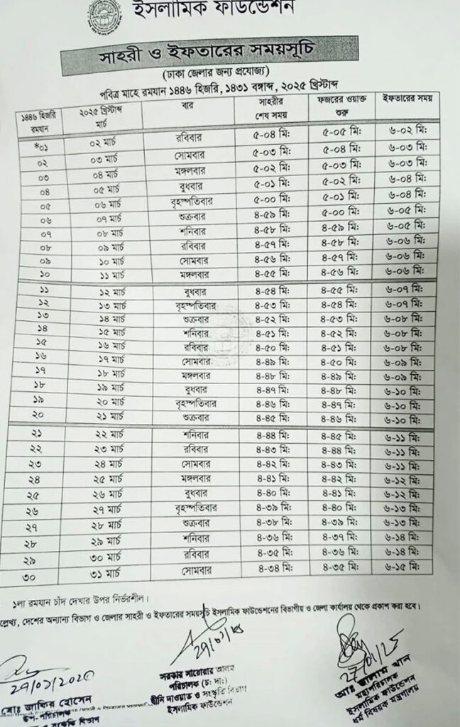 সময়সূচি অনুযায়ী, ২ মার্চ প্রথম রমজানে ঢাকায় সেহরির শেষ সময় ভোররাত ৫টা ৪ মিনিট ও ইফতারির সময় ৬টা ২ মিনিট।
