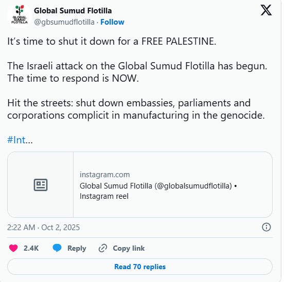 ইসরায়েলের হাতে তাদের জাহাজ ও কর্মী আটকের পর বিশ্বব্যাপী প্রতিবাদের ডাক দিয়েছে ‘গ্লোবাল সামুদ ফ্লোটিলা’। বৃহস্পতিবার (২ অক্টোবর) রাতে এক্স (সাবেক টুইটার)-এ দেওয়া এক বিবৃতিতে সংগঠনটি জানিয়েছে, তাদের নৌবহরের ওপর ইসরায়েলি বাহিনী আক্রমণ চালিয়েছে।