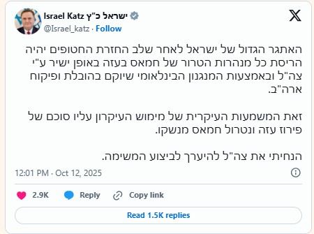 ইসরায়েলের প্রতিরক্ষামন্ত্রী ইজরায়েল কাটজ নতুন যুদ্ধবিরতি চুক্তি ঘোষণার এক দিনেরও কম সময় পর ঘোষণা দিয়েছেন যে, অবশিষ্ট জিম্মিদের মুক্তির পর ইসরায়েল আবারও গাজায় সামরিক অভিযান শুরু করবে। তার এই ঘোষণা নতুন সম্মত যুদ্ধবিরতি কাঠামোর প্রকাশ্য লঙ্ঘন হিসেবে দেখা হচ্ছে।