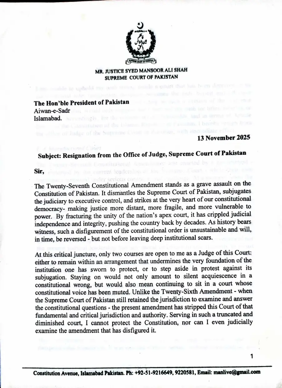 ১৩ পৃষ্ঠার পদত্যাগপত্রে বিচারপতি শাহ সংশোধনীকে পাকিস্তানের সংবিধানের ওপর গুরুতর আঘাত হিসেবে বর্ণনা করেছেন। তিনি লিখেছেন, সংশোধনীটি সুপ্রিম কোর্টকে ভেঙে দিচ্ছে, বিচারব্যবস্থাকে কার্যনির্বাহী শাখার নিয়ন্ত্রণে নস্যাৎ করছে এবং দেশের গণতান্ত্রিক কাঠামোর মূল ভিত্তিকে আঘাত করছে।